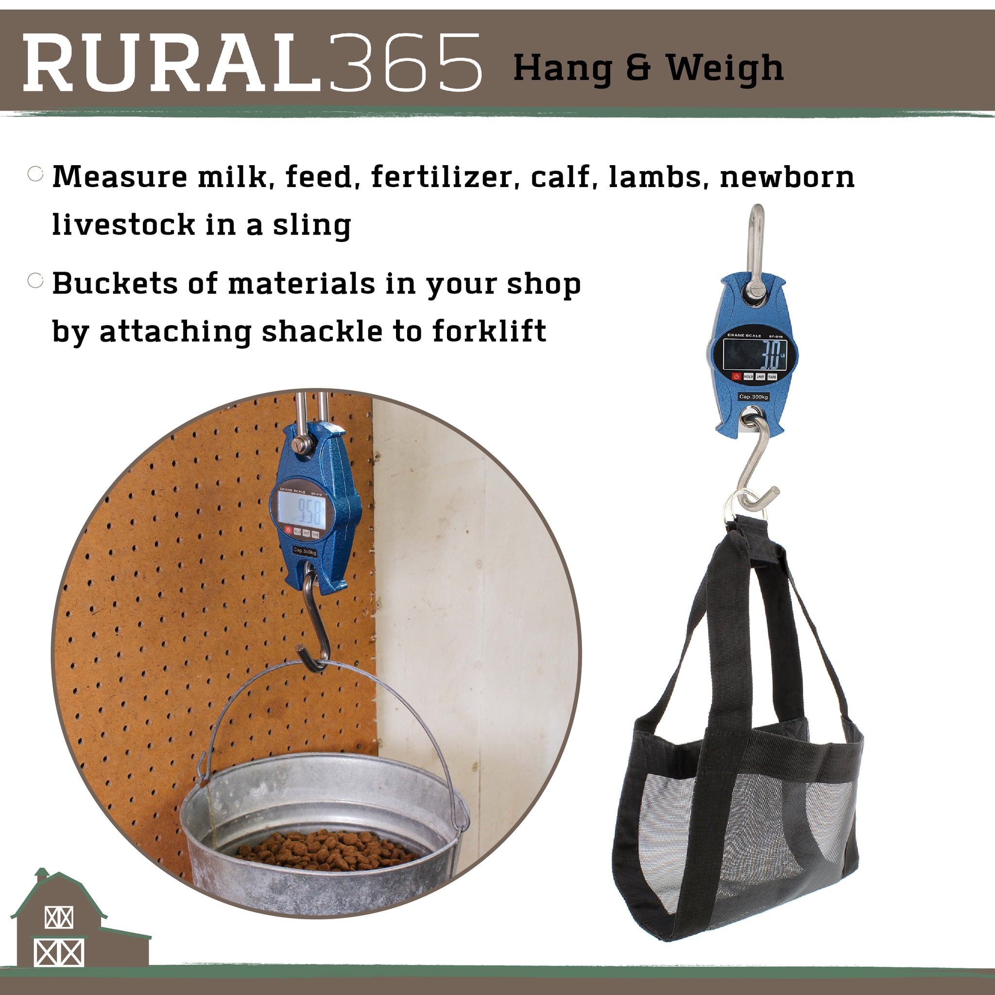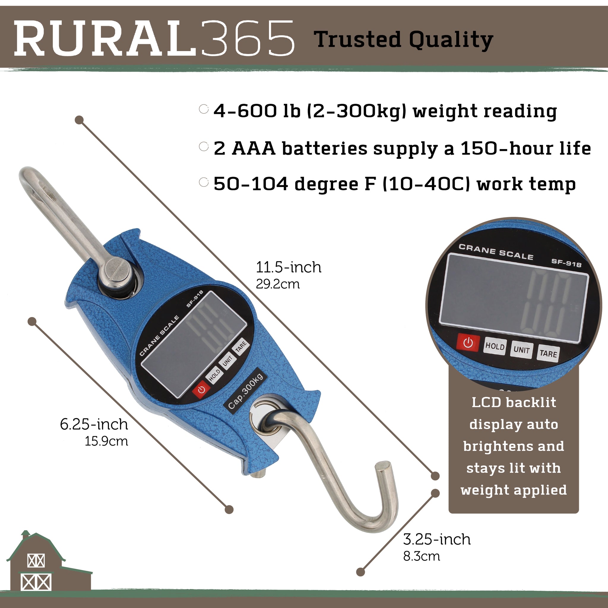 [Hang & Weigh]: Use Rural365 Orange or Blue Digital Hanging Scale Farm Heavy Duty Scale with milk, feed, fertilizer, calf, lambs, newborn livestock in a sling; Turkey, wild feral hog, deer, fish, 600 lb bear; Buckets of materials in your shop by attaching shackle to forklift [Trusted Quality]: 4-600 lb (2-300kg) weight reading; 2 AAA batteries supply a 150-hour life; Game hanging scales digital weight bottom S-hook, top U-shackle for lifting straps/chains; 0.2-inch (4mm) weight sensor; 50-104 degree F (10-40C) work temp [Quick Read]: 2.25x1.1in (5.7x2.8cm) LCD backlit display; Crane hook scale unit mode function for g, oz, lb, kg and records weight in 1/10th increments; Auto brightens and stays lit with weight applied, dims after 10 seconds of inactivity (measures 0), auto-off after 3 minutes of inactivity [Perfect Size]: 11.5in (29.2cm) overall length with both hooks included; 3.25x1.5x6.25in (8.3x3.8x15.9cm) scale unit; 0.4in (1cm) thick bottom S-hook and top hook with 1.75x2.25in (4.4x5.7cm) inside diameter and 1.6x3.75in (4.1x9.5cm) outside diameter [Easy Use]: Access 2 AAA battery chamber with Phillips screwdriver (not included); S-hook to hang or handhold sides; Measures current weight with hold button (doesn’t measure peak); Includes overload/low battery indicator, auto zero reset/power off, hold, 4 unit switch, tare